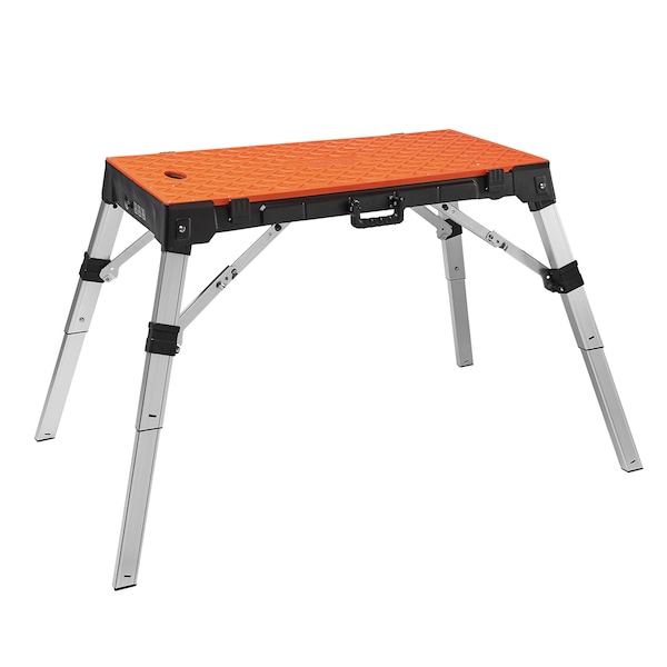 WORKTABLE, Clamping System Standard Bar Clamp, Folded Depth 5 in, Folded Width 20 in, Frame Material Steel, Height Adjustment Mechanism Pull Pin, Minimum Adjustable Height 5 in, Overall Fixed Height Not Applicable, Overall Load Capacity 500 lb, Overall Width 19 in, Work Surface Material Plastic, Work Surface Width 20 in, Included Components Accessory Tray, Built-in Protractor, Built-in Ruler, Handle, Assembly Fully Assembled, Caster Mount Type Plate, Caster Type (2) Rigid, (2) Swivel