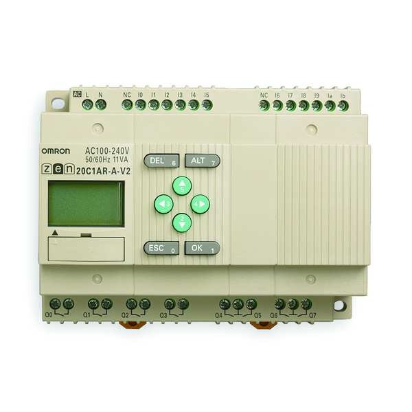 Programmable Relay, Input Voltage 100 to 240V AC, Output Type (8) Relay, 4.5 A Amps, Number of Inputs 12, Number of Outputs 8, Counters 16, Timers 16, Yes Clock, LCD Display, Calendar, Depth 2.2 in, Height 3.54 in, Width 4.82 in