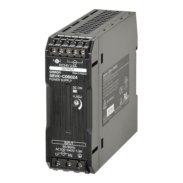 Switching Power Supply, Input Voltage 100 to 240V AC, 90 to 350V DC, Output Voltage 24 V DC, Power Rating 60 W, Output Amps 2.5 A, Mounting Bracket, Switching, Height 94.7 mm, Width 32 mm, Depth 110 mm, Series S8VK-C, Hz 50 Hz/60 Hz, Phase - Electrical Single, IP Rating IP20, Status Indicator Green DC OK Signal, Operating Temp. Range -25 Degrees to 60 Degrees C, Standards CE, cRUus, CSA C22.2 No. 107.1/62368-1, EN55011 Class A, EN61204-3, EN62368-1, EN62477-1, UL Listed, UL508/62368-1