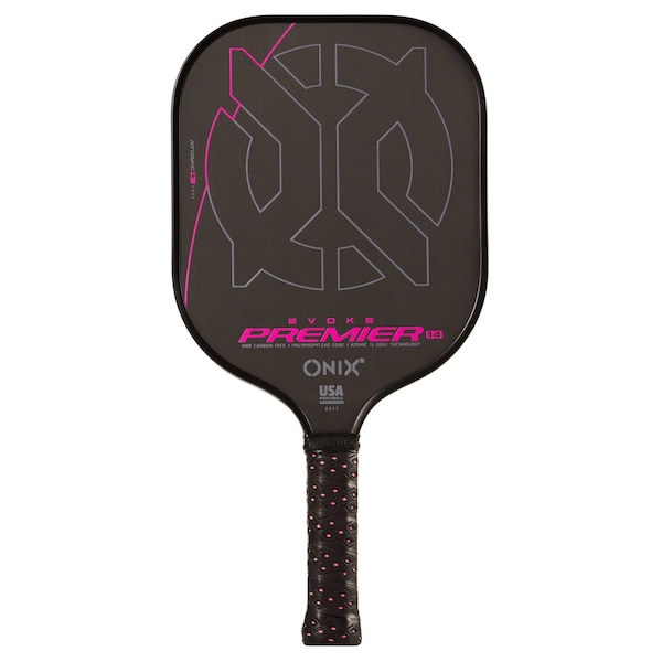 Introducing the all-new Evoke Premier Raw Carbon Paddle from ONIX Pickleball, this raw carbon fiber surface texture increases traction on the pickleball for maximum spin and control without sacrificing pop and power. The polypropylene core provides a lightweight and durable paddle with excellent all-around maneuverability. This lightweight pickleball paddle is also constructed with a non-slip, comfort grip that makes it easy to control on the court. These paddles are USA Pickleball USAPA approved for tournament play. A full edge guard provides added protection during aggressive play. Raise the level of your game. Play Your Best with ONIX!