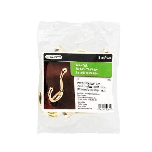 3 38inch HeavyDuty Utility Metal Coat Hook, Brass Finish, 5PK