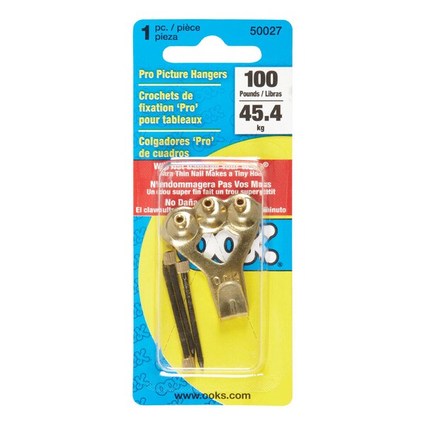 Hang heavy pictures or paintings on a wall with this Ook 100 lbs. Professional picture hanger. The hanger includes 3 nails and distributes the weight of the picture evenly to support up to 100 lbs.