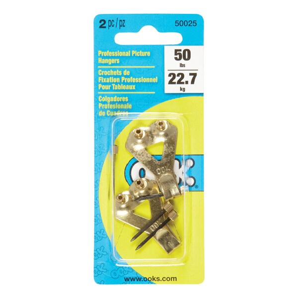 The Ook 50 lbs. professional picture hanger has reusable nails that glide in easily to help leave a pin size hole in wall surface. Ideal for drywall and plaster wall surfaces. Holds frames that weigh up to 50 lbs.