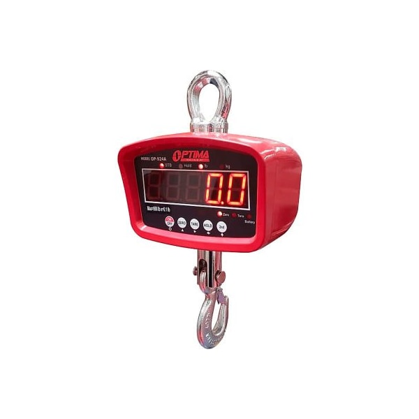 Optima general purpose led crane scale with remote 2,000 lb x 1 lb optima scale's op-924 series digital crane scale is an economical weighing solution for genral purpose weighing. This crane scale features an easy-to-read , backlit led display that indicates measured values in either pounds lbs or kilograms kg. The op-924 series crane scale is powered using rechargeable battery pack. The standard remote controller allows users to change units, clear measurments, zero and tare out weight and capture peak weight at a distance of up to 100 feet 30m.