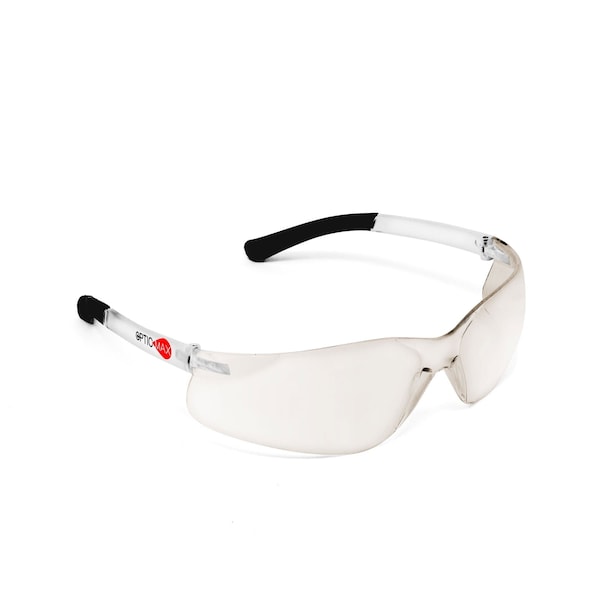 Polycarbonate single-piece wrap-around lens, non-slip rubber temple tips, scratch resistant coating, Indoor/Outdoor Lens