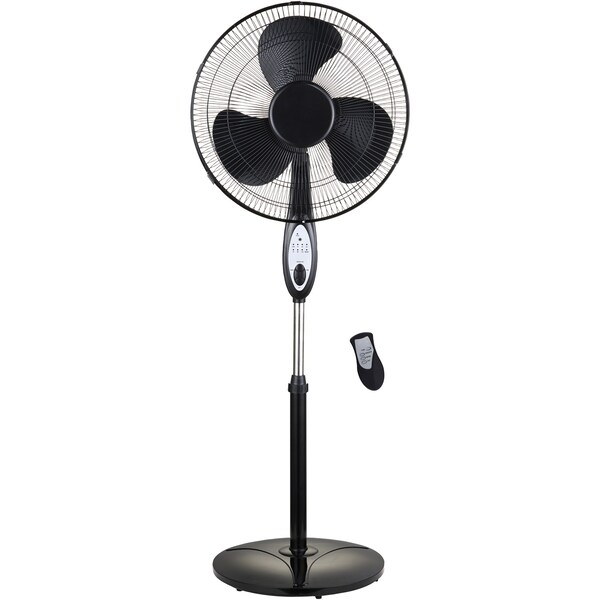 The Optimus 18 in. Oscillating Stand Fan with Remote features 3 speeds of energy-saving and whisper-quiet operation. It has a 4-position piano key switch on the pole and 90-degree oscillation. The height and tilt angle are also adjustable.