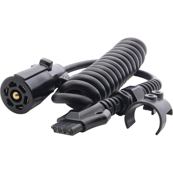 The 5-Way Flat to 7-Way Round Trailer Light Connector features a coiled cord. Allows vehicle to tow a camper or boat trailer with hydraulic brakes. Coiled cord stretches and contracts preventing unneeded stresson wires. Threaded mounting bracket ensures secure connection to vehicle.