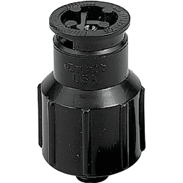Durable noncorrosive plastic construction. 1/2-inch FNPT (female pipe thread) connection. Brass flow adjustment screw. Inlet filter basket prevents debris from clogging nozzle. Ideal for planters and shrub areas.