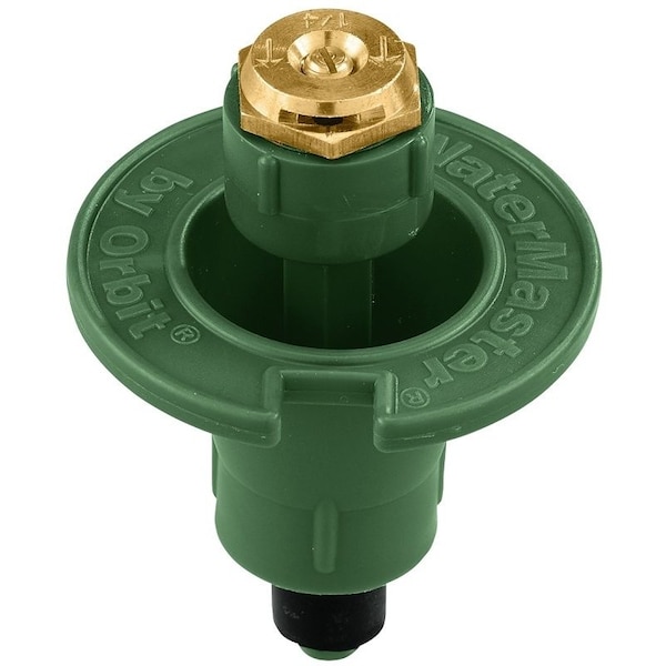 This plastic popup sprinkler head has a halfcircle spray pattern It is ideal for smallersized yards with shallow irrigation systems The brass nozzle has an adjustable flow screw and sprays a distance of 10 to 15 ft radius The stem rises 134 in above the ground and drops into the riser when not in use