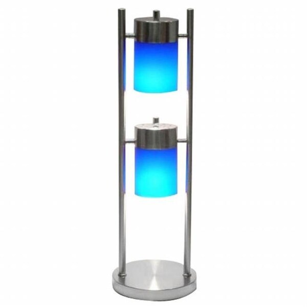 Modern style. Polished metal base with blue plastic shades. Frosted blue shade color gives light a cool glow. UL listed; uses three 60-watt bulbs (not included). Blue light. Table Lamp. Dimensions: 9" W x 9" D x 25 H.