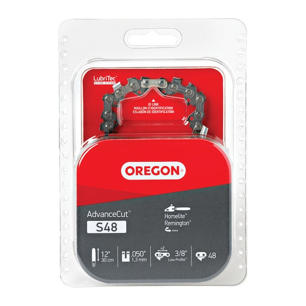 The Oregon S48 AdvanceCutTM Saw Chain is for homeowners and occasional users who want a low-vibration and low-kickback saw chain. The Chamfer Chisel cutters' twin cutting corners offer outstanding performance. These cutters are durable, easy to maintain and forgiving.