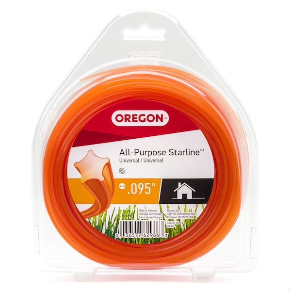 OREGON 619770 Trimmer Line, All-Purpose Starline, Star Shape, 150 feet, .095 Diameter Line. Impact resistant All-Purpose Starline is made from a Nylon co-polymer that is fortified with additives so it lasts longer and breaks less. .095'' diameter trimmer line is a good size for cutting heavier weeds in your lawn or performing light commercial work. The Star Shape Provides 6 sharp-cutting sides to help make easy work of low to medium tall grass. Trimmer line comes in a user-friendly, donut-shaped container for easy storage and fewer tangles. Oregon All-Purpose Starline offers a flexible, durable line for everyday use. Whether you are trimming or edging around garden beds, Oregon's trimmer line features long lasting, high-quality materials and is compatible with most standard trimmer heads including fixed-line, semi and automatic bump-feed heads. Additionally, it fits most gas, electric, and battery-powered curved and straight shaft string trimmers. Check your string trimmer manual for recommendations and to ensure that larger lines will work with your trimmer.