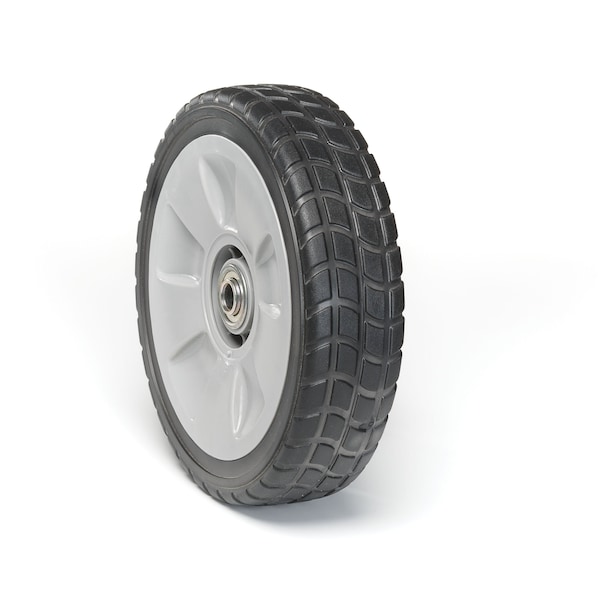 A semi-pneumatic wheel with wave tread to grip mud and ease over roads.
