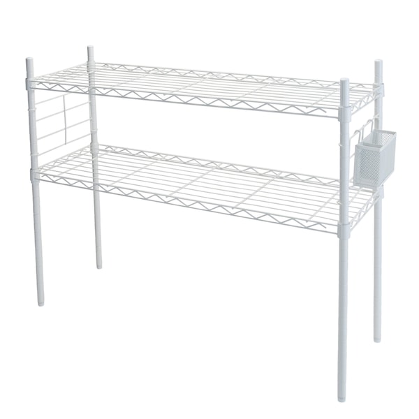 Double your space with the Organize it All Etagere shelves. Designed with 2 adjustable shelves and a steel frame, this shelf is strong and durable. Can easily fit over a lap top or on a desk to create storage space. Strong enough to hold textbooks, supplies, any storage or decor. The grated shelves allow you to clip and hang pictures, mirrors, keys, and more, maximizing your decor opportunities and storage space.