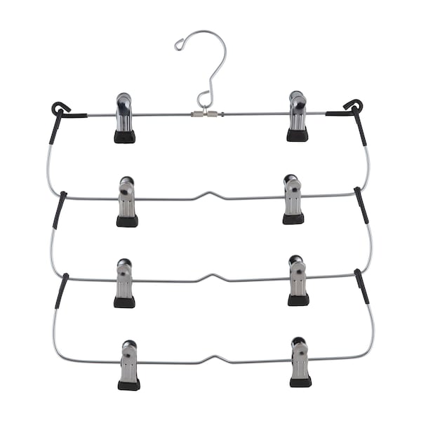 Keep your closet looking neat and organized with the Neu Home 4 tier Skirt Hangers. Made to hold skirts or slacks with clips to prevent from falling on your closet floor. Two clips on each bar with rubberized tips prevent wrinkling and creases. Super slim multi-tier design, best for optimizing the space in your closet.