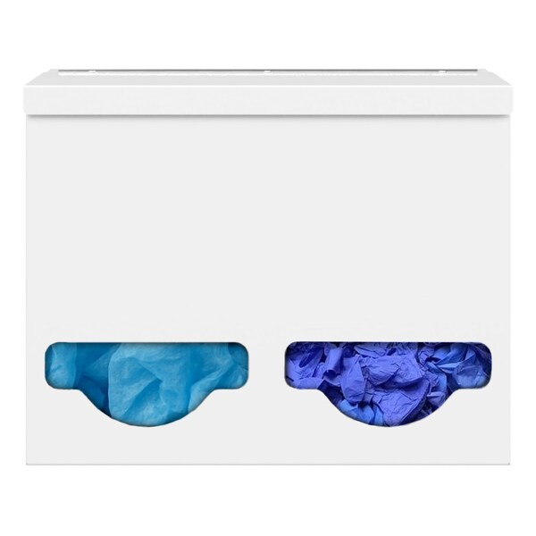 ORIGIN Double Bulk Dispenser - White Coated Steel 2 Compartments. Dual Dispense. Wall Mount Durable, dual-compartment bulk dispenser with top-loading and top/bottom dispensing for versatile use. Crafted from white coated steel for long-lasting strength and a clean, professional look. Ideal for efficient storage in medical, lab, or other workplace environments..