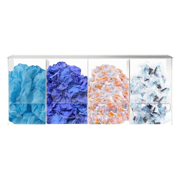 ORIGIN Quad Bulk Dispenser - Clear PETG 4 Compartments. Dual Dispense. Wall Mount Top-loading with smooth bottom dispensing, this four-compartment dispenser offers organized access to earplugs, boot covers, bouffant caps, beard restraints, and more. Made from durable, crystal-clear PETG for visibility and fast refills. Perfect for high-traffic medical, industrial, or commercial settings.. The ultimate storage solution for clean, efficient supply access-order now!