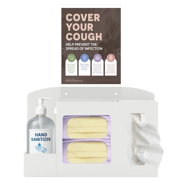 ORIGIN Respiratory Hygiene Station Bundle - White Includes: HS10X04WH Station, SN10X01CL Sign Holder Wall or countertop hygiene station stores masks, tissues, and sanitizer. Compact, organized setup for promoting respiratory safety at healthcare entry points. White-coated steel. Sleek, durable. Ideal for clinics, hospitals, and medical facilities focused on infection control.