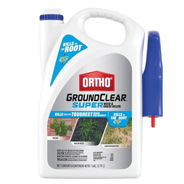 Use Ortho GroundClear Super Weed & Grass Killer to kill 175 different weed and grass types including crabgrass, dandelion, nutsedge and oxalis. The quick kill, dual-action formula starts working immediately as one ingredient kills on contact while the other penetrates deep into the plant to kill all the way down to the roots. Sprayed weeds usually begin to wilt within hours after being treated, with weeds completely killed in 1 to 2 weeks. Apply this ready-to-use weed and grass killer in landscape areas, patios, walkways, gravel, mulched areas, along houses and fence lines and on driveways when weeds are actively growing and the air is calm. It's easy to use, simply turn the sprayer nozzle to the desired setting and squeeze the trigger repeatedly. Rainfall or watering 15 minutes after application will not reduce the effectiveness of this powerful weed control. A single application of Ortho GroundClear Super Weed & Grass Killer will start to control even the toughest weeds and grass right down to the roots.