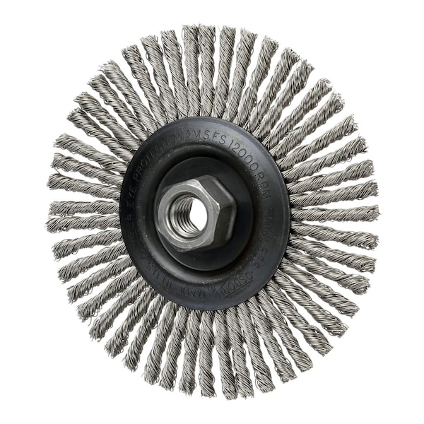 SS Wire Stringer Bead Brushes, 4'' dia., 5/16'' wd., 5/8''-11 threaded arbor, 7/8'' trim lg., 12PK