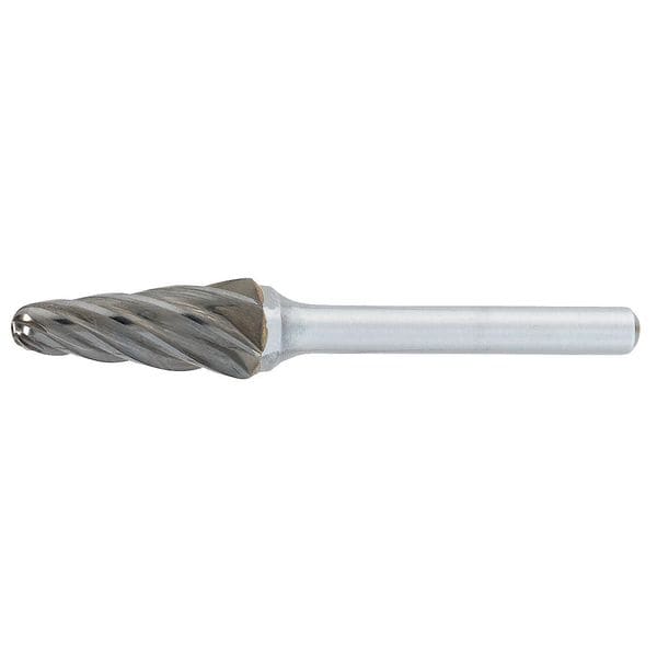 Cone Bur, End Type Radius, Cut Type Aluminum, Shank Dia. 1/4 in, Head Dia. 1/2 in, Head Length 1 1/8 in, Included Angle 14 Degrees , Overall Length 2 in, Trade Number SL-4A, Head Shape Cone, Operating Speed - Maximum 50,000 RPM, List Number 887, Coating Bright (Uncoated), Head Material Carbide, Shank Material Hardened Steel