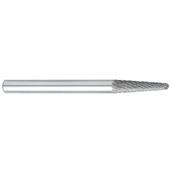 Cone Bur, End Type Radius, Cut Type Double, Shank Dia. 3 mm, Head Dia. 3 mm, Head Length 12 mm, Included Angle 8 Degrees , Overall Length 38 mm, Trade Number SL-42, Head Shape Cone, Operating Speed - Maximum 80,000 RPM, List Number 800, Coating Bright (Uncoated), Head Material Carbide, Shank Material Carbide