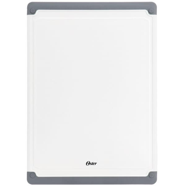 The Oster Bergen 17x12 Inch Rectangular Plastic Cutting Board lets any user cut and prep ingredients with ease. Featuring non-slip feet at every corner so the board never slip away while you're handling sharp tools. The large board includes side grooves to catch water and juices while you chop. The plastic body is easier to maintain compared to traditional wood cutting boards. Chop, slice, mince, and dice your way to newer dishes.