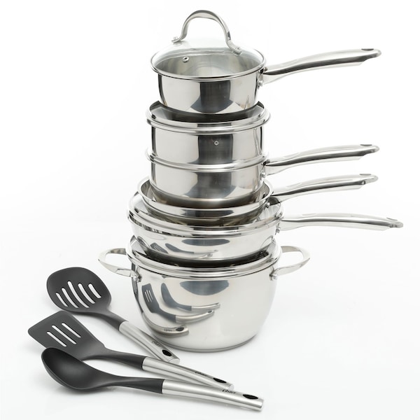 Get your kitchen off to a great start with this stainless steel cookware set from Tools of the Trade. The 13 pieces include the basics you'll use most plus utensils and a steamer. A heavy-gauge aluminum core is sandwiched between two layers of stainless steel by means of high-heat, high-pressure impact bonding for extreme durability. Aluminum core provides superior conductivity and even heating for excellent browning and control of the cooking process. Non-porous stainless steel cooking surface is safe for use. Clear tempered-glass lids let you see food while it's cooking and are oven safe, so you can finish covered dishes in the oven or keep them warm until ready to serve Long, brushed stainless steel handles stay cool on the stovetop. All cookware is dishwasher-safe.