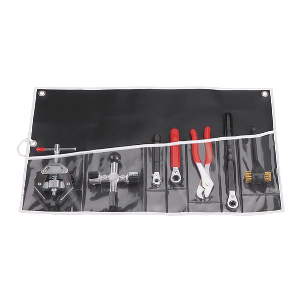 Kit includes: A heavy-duty battery terminal puller, 3-way battery post/cable cleaner and reamer, angled battery nut pliers, GM 5/16" battery terminal ratchet wrench, extra long 5/16" terminal ratchet wrench, 10 mm battery terminal ratchet wrench, and side terminal battery brush