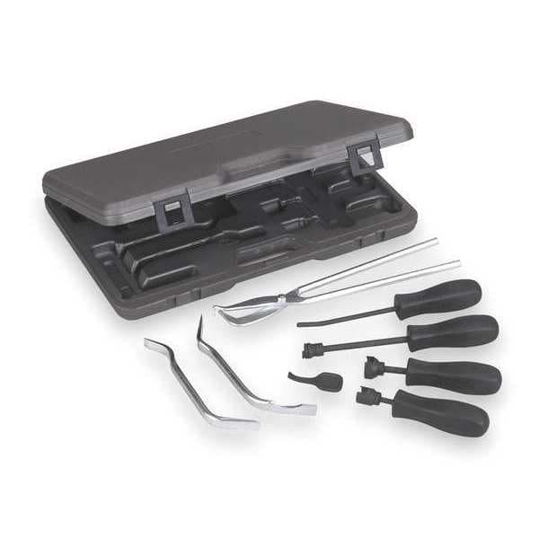 Brake Tool Set, Tool Type Brake Tool Set, Application Servicing Drum Brakes, Overall Length 11 in, Number of Pieces 8, Material Carbon Steel, Includes (3) Brake Spoons, (5) Brake Spring Tools, For Use With Import and Domestic Vehicle, Number of Sockets Included 0