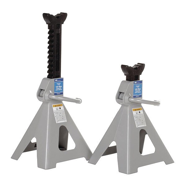 Jack Stands,12 tons, Load Capacity per Pair 12 ton, Minimum Height 17 1/2 in, Maximum Extended Height 27 1/2 in, Base Length 12 1/8 in, Base Width 10 7/8 in, Features 12 Adjustment Positions