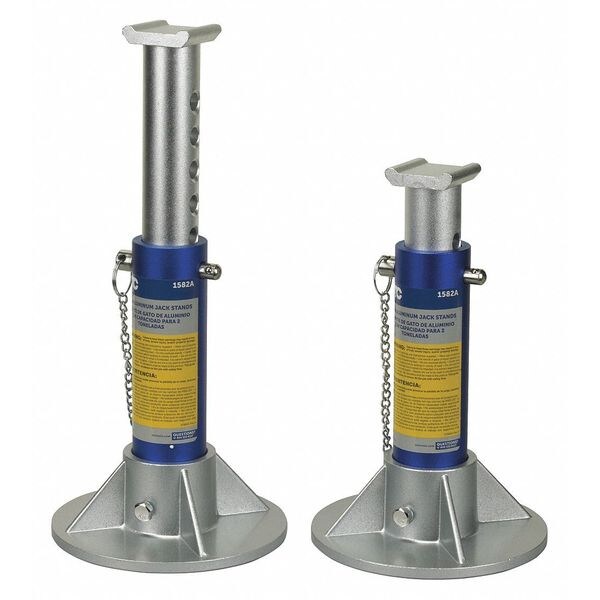 Jack Stands, Load Capacity per Pair 2 ton, Minimum Height 9 1/2 in, Maximum Extended Height 15 1/8 in, Base Shape Round, Standards ANSI/PASE, Base Diameter 7 in, Features Lightweight, Includes (2) Jack Stands, Locking Mechanism Pin, 1 Pair