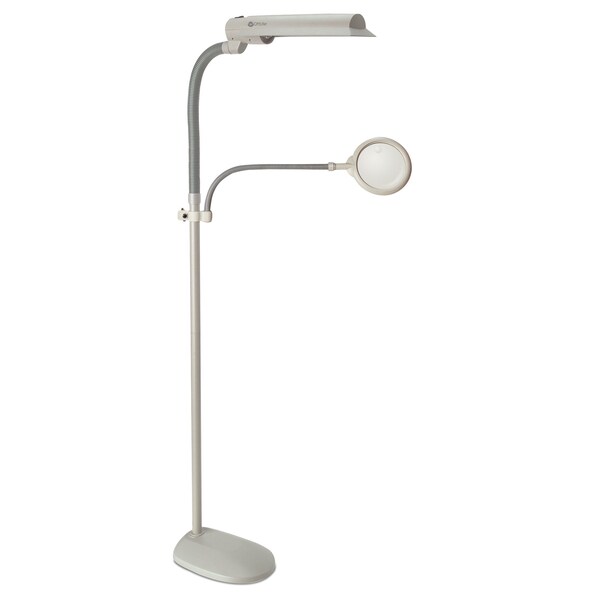 The 18w EasyView Craft Lamp combines OttLite natural daylight illumination with an adjustable 3x optical grade magnifier arm making it the perfect tool set for seeing details clearly and colors accurately The wide wing shade rotates to direct light right where you need it and the flexible neck lets you easily adjust the height as you work This standing lamp is ideal for projects in the crafting room, workshop, home or office The low heat, low glare OttLite illumination helps reduce eyestrain for hours of creating in comfort Flexible neck and multiposition shade directs light where you need it Adjustable up to 3x optical grade magnifier attachment 5 diameter Compatible with Wheel Base Accessory Bulb included Rated to last up to 10,000 hours Replacement bulb type B