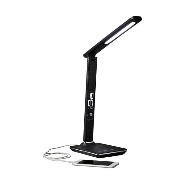 Part of the Ottlite Wellness Series, the Renew LED Desk Lamp features healthy lighting technology plus a USB charging port and LCD with date, time, ambient temperature and alarm. Enjoy a healthier way to see with the OttLite's ClearSun LED, an exclusive technology that helps to dramatically reduce eyestrain and glare by up to 51 percent. It comes as close to the sun's spectral output as you can get and provides smooth, uniform light with color rendering index CRI of 97. Maximum output is 400 lumens with six brightness settings and touch-activated control. Height adjusts from 7-1/2'' to 14-3/4'' to better direct light to where you need it. LCD includes battery backup to save settings in the event of power interruption. Stylish lamp features faux-leather texture and chrome accents. The 5-volt, 2.1A USB port fully charges tablets, phones and more.