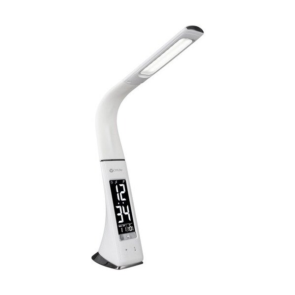OttLite brings the eyestrain-reducing power of ClearSun LED technology together with the sanitizing power of Visible Light Disinfection to provide the ultimate healthy light. Simply turn on this Thrive LED Desk Lamp with Clock to begin sanitizing your space against potentially harmful bacteria, mold and fungi. Super-flexible silicon neck lets you direct light right where you need it. This flexible lamp adjusts from 10'' to 18-3/4'' and features an LCD that displays date, time and ambient temperature. Plus, the built-in USB charging port keeps your devices charged. Plastic desk lamp also features chrome accents and textured head and base with stitching detail. Base measures 2.65'' x 3.625''.
