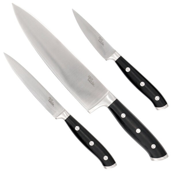 The Our Table 3 Piece Triple Riveted High Carbon Stainless Steel Cutlery Starter Set makes for the perfect addition to any home chef. Its full tang blade and ergonomic handles provide perfect balance and use for cooks of all skill levels. Enjoy longer lasting sharpness with the high carbon stainless steel construction and tapered blade shape. The set features a paring knife, one utility knife and a chef's knife for a variety of prep jobs. Chop, slice, dice, peel, and more to create the perfect dinner.