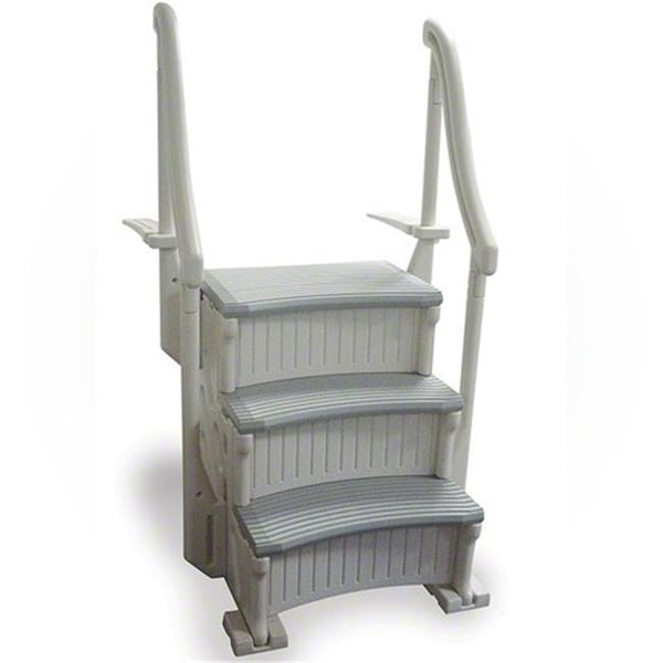 This elegantly designed 3-Step staircase is for in-ground pools and provides appealing aspects to onlookers. The beige staircase with gray treads owns a unique design with curved stairs that can be assembled to curve in or out depending on the swimmers preference. This base staircase has the ability to attach to an extra unit that extends the staircase for a wider body and a graceful in then out curve. The handrails are perfectly sloped to include style and comfort ability. The base pads on this stair-set are adjustable to fit any pool floor - even if the floor is slightly dished in. This durable staircase can withstand up to 400 pounds at one time and is simple to install and assemble with no hardware required.