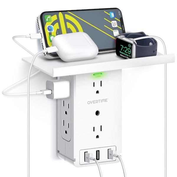Tired of having to decide what to unplug when wanting to charge your phone or plug in a new electronic device? Wish you could charge your USB devices and standard AC powered devices simultaneously from a single outlet on your wall? If so, then we've got the answer you've been looking for!This multi-plug wall outlet can be easily plugged into any AC wall outlet, instantly transforming 1 wall socket into 8, and 3 USB Type-A ports as well. Our electrical outlet extender is also incredibly small and compact, sitting right up against your wall so that it doesn't take up any extra space or lay across the ground becoming a hazard like other wall outlet surge protectors. Plus, being SGS certified for safety and providing numerous safety features such as surge protection up to 1020J, our wall outlet with USB ports combo is seen as the ultimate space and outlet saving solution.Each of the three USB charging ports on our outlet shelf are universal type-A USB ports and have a power output of 3.4 AMPs, allowing them to fast charge all your USB devices. The three USB ports can be used simultaneously with each other and the eight AC outlets, letting you charge and power your devices at the same time.Use the built-in shelf for a convenient place to set your phone or gaming device while charging, hold up a speaker, or keep your toothbrush and dryer off the vanity or sink top. From the safety angle, we've outfitted our sockets with a wide variety of safety features such as LED light notification for surge protection, USB over voltage and over current protection, short circuit protection, and a fireproof shell that is fire-resistant up to 1382 DegF. Most importantly, our socketshelf has been rigorously tested and is SGS certified for safety.