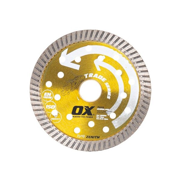 The OX TU10 Trade Series blade is guaranteed to cut granite, clay products, engineering bricks, concrete products and building materials. The OX Trade Series Diamond Blades allow users to get value for money without compromising on performance or safety. Not only are these the best blades available at this price level, they also offer the most comprehensive and clear choice. The OX TU10 blade is designed to work with angle grinders, circular saws, power saws and tile saws.