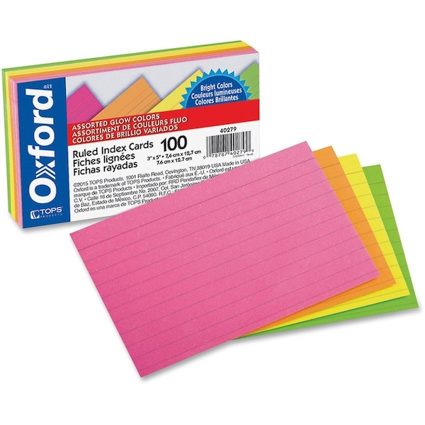 Index cards are perfect for organizing and getting noticed. Each card is ruled on one side and quality-engineered, commercial quality. Assorted colors include 25 each of Glow Green, Glow Yellow, Glow Pink and Glow Orange.