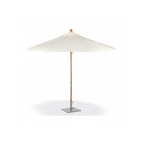 Sturdy market umbrella is both practical and stylish. ScotchGard treated fabric to ensure enduring quality. Solid brass two-pulley lifting system. Eight solid hardwood ribs attach to hardwood pole. 1 3/8" diameter solid hardwood pole with composite hub. Stand as shown in picture is not included.