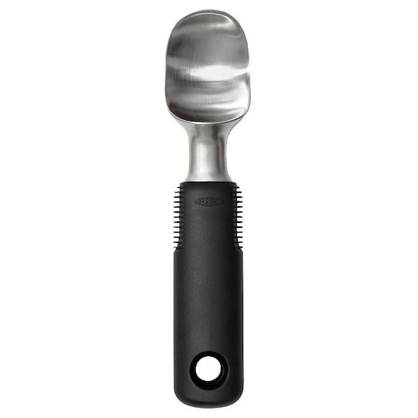 You know you're not going to wait for ice cream to soften before you Scoop it. So good news the pointed shape and comfortable weight of the OXO Good Grips solid stainless steel ice cream scoop mean you can glide right through even hard ice cream. The flat edges let you scrape every last bit from the corners of your container. The non-slip grip is comfortable even when scooping dish after dish and the stainless steel head won't chip, pit or discolor. Dishwasher safe.