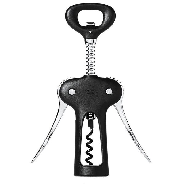 Impress any guest with this OXO Good Grips winged corkscrew with bottle opener. Whether they want a glass of red or a cold beer, this durable, die-cast zinc Corckscrew is up for the job. The comfortable turning knob, contoured wings, and helix-style non-stick screw make opening cork-topped bottles a smooth operation, while the built-in bottle opener makes quick-work of pop-top beverages. Designed to stay stable on wine bottles, this fumble-free tool will be a hit at your next party.