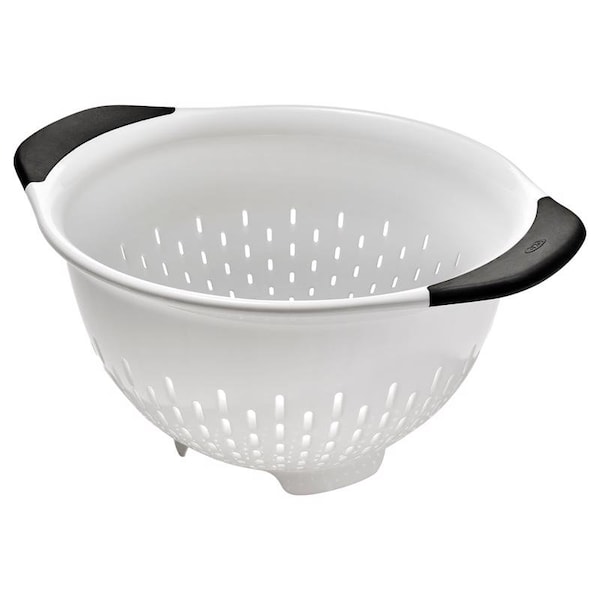 The Oxo Good Grips 3-qt./2.8 L colander is an efficient tool for rinsing veggies and straining pasta. Contoured feet keep Colander steady in sinks, and the non-slip handles provide a comfortable grip, even when your hands are wet. The elevated design keeps colander away from the bottom of the sink to prevent pooling. The sturdy construction can handle heavy food and the smooth material is easy to clean.
