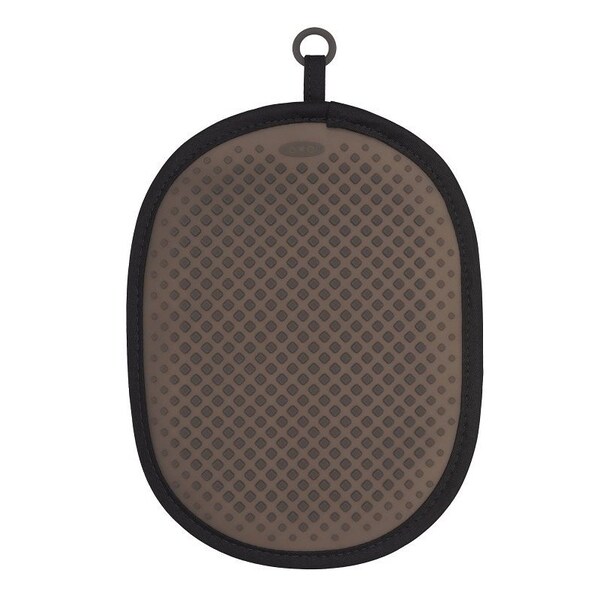 Hold hot items with confidence and care using the OXO Good grips pot holder. The silicone body features a dexterous, non-slip diamond pattern that stands up to flames, stains and steam. Slide a hand into the Insulated backside pocket for maximum control and comfort. The pot holder can also be used as a trivet to protect sensitive surfaces from hot cookware. When you're finished, rinse the pot holder clean or wipe it down with a damp cloth before hanging it from the convenient loop.