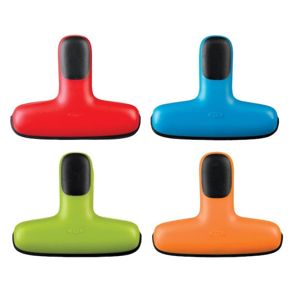 Seal extra-large family-size bags with ease with the OXO SoftWorks Bag Clips. The extra-wide mouth and non-slip closure makes an ideal seal for bulk bags of pretzels nuts flour and other household staples. Each Clip has soft non-slip touchpoints that are easy on hands plus a center opening for hanging storage. Our convenient Clips can be used around the house to hold open cookbooks hang calendars or secure folders.