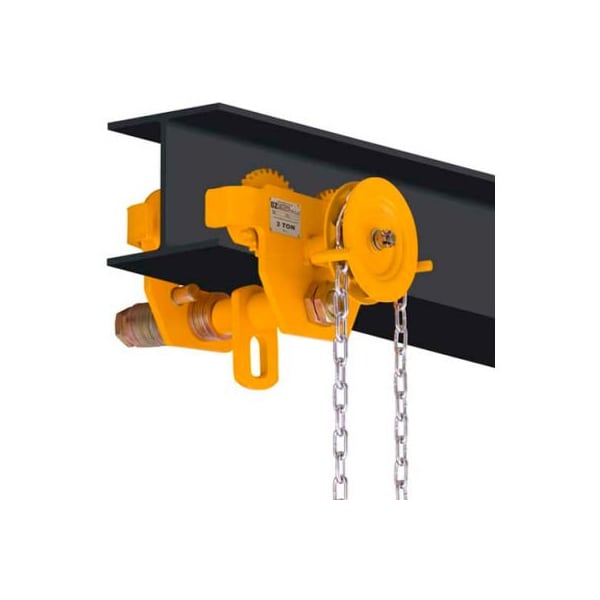 Oz lifting geared beam trolley, 3 ton capacity geared beam trolley - the geared beam trolley is designed for the user who has a precision lift and needs the ability to move slowly across the beam with the least amount of sway, the precision ball bearing trolley wheels make it easy to maneuver heavy loads into position at any given point along the i, s, or w beam. The gbt has anti drop plates, double baked enamel paint, with individual test certifications, and serial numbers for complete traceability. features and benefits lightweight robust construction fits to most i, s, and w-beams durable baked enamel paint protection gearing provides positive load positioning along the beam precision ball bearing trolley wheels anti-drop plate stainless steel id tag individual test certificate & serial number