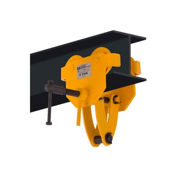 Oz lifting beam trolley with clamp, 5 ton capacity beam trolley with clamp - this versatile trolley clamp combo gives you the option to roll like a trolley or lock down like a clamp, it's lightweight, moves super quick from beam to beam, has precision ball bearing trolley wheels, anti-drop plate, durable baked enamel finish, stainless i.d. Tag and individual test certificate and serial number. Each trolley has a lock down screw for added safety, this unique trolley also adjusts to most i, w , and s beams with ease. features and benefits lightweight robust construction fits to most i, s, and w-beams safety handle lock durable baked enamel paint protection precision ball bearing trolley wheels anti-drop plate stainless steel id tag individual test certificate & serial number