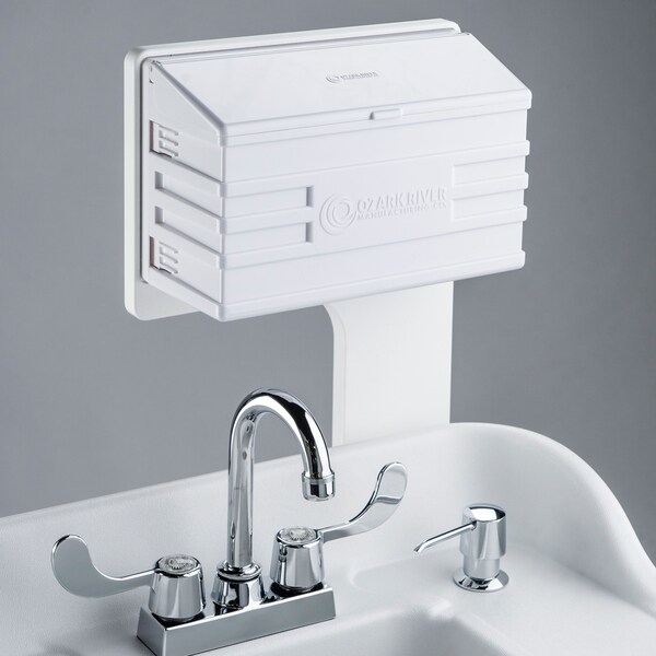 White ABS M-Fold paper towel dispenser to be mounted on the portable sink or hardware to attach to the wall near a sink or anywhere.