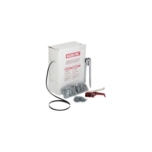 THIS COMPLETE SELF-CONTAINED STRAPPING KIT CONTAINS 1/2" PLASTIC LIGHT DUTY STRAPPING. IT HAS 1000 1/2" OPEN SEALS, 1 TENSIONING TOOL AND 1 SEALING TOOL.